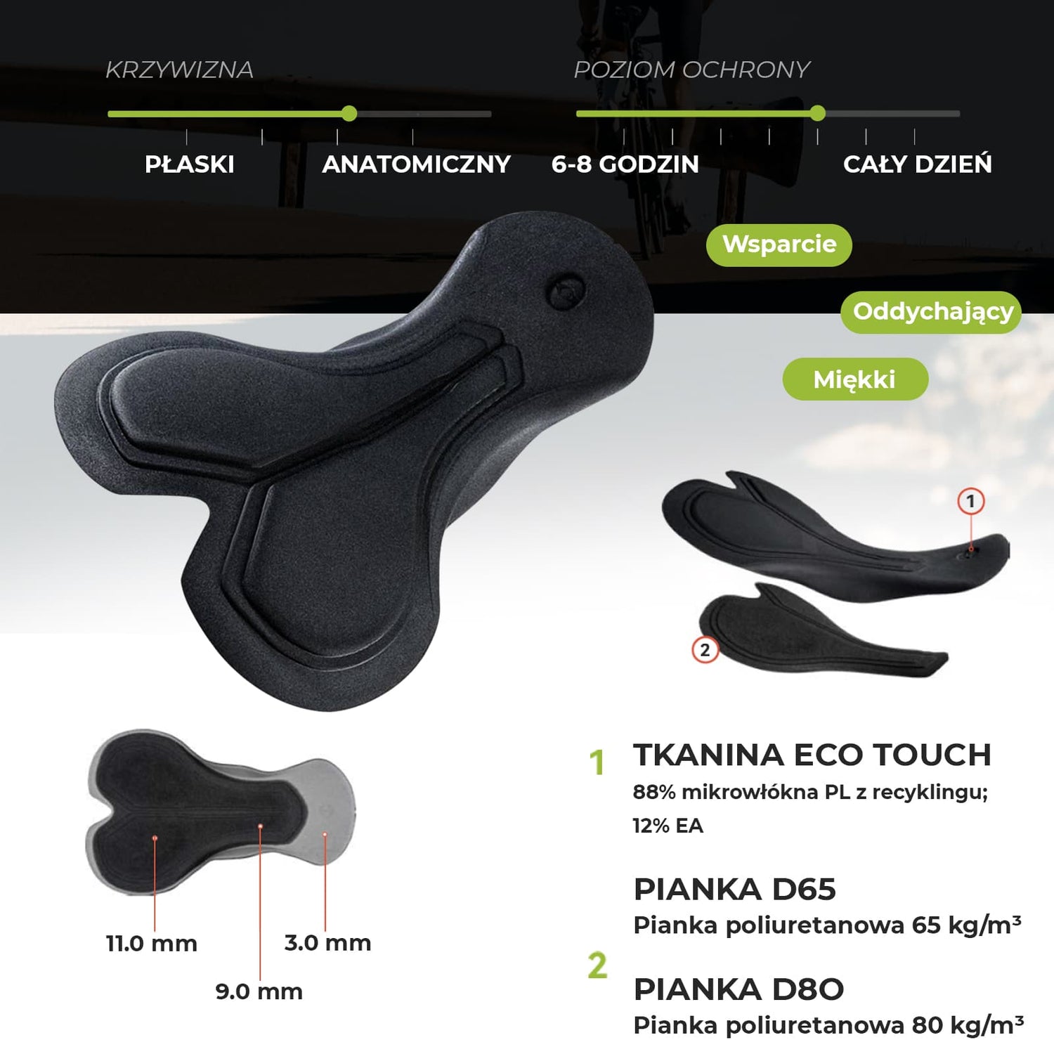 Funkcjonalna wkładka o podwójnej gęstości – amortyzacja i higiena Zastosowany materiał ECO X-MIX w połączeniu ze strefową pianką gwarantuje efektywne odprowadzanie wilgoci. Strefa o grubości 11 mm absorbuje wstrząsy i odciąża krocze, natomiast 3-milimetrowa strefa komfortu zwiększa elastyczność i dopasowanie. Wkładka idealnie sprawdza się podczas średnich i długich tras (6–7 godzin jazdy).
