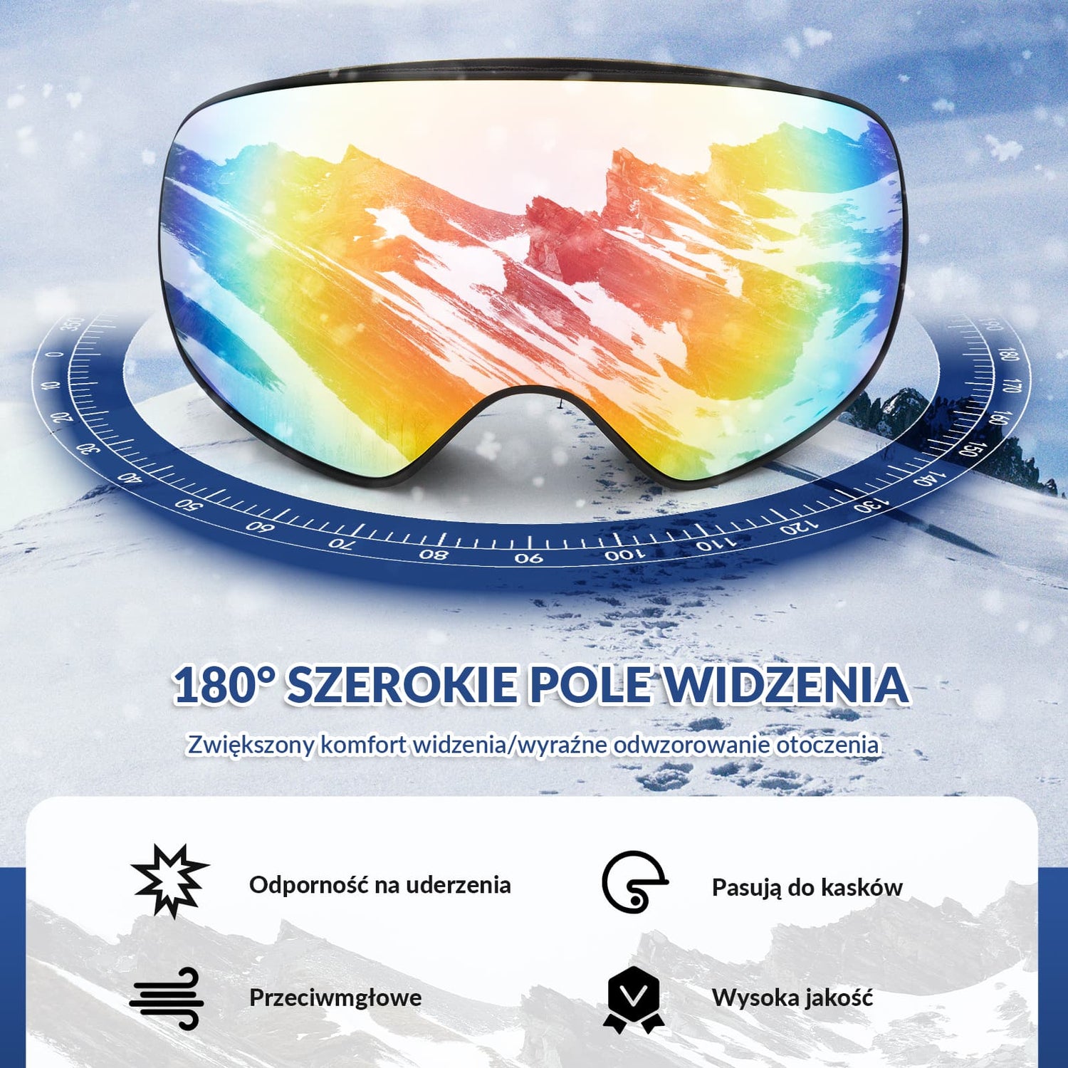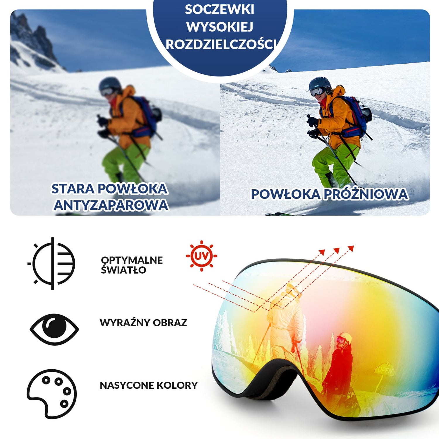 Duża soczewka z powłoką przeciwmgielną gwarantuje szeroką perspektywę i czystą widoczność, minimalizując ryzyko parowania i zwiększając bezpieczeństwo na stoku.