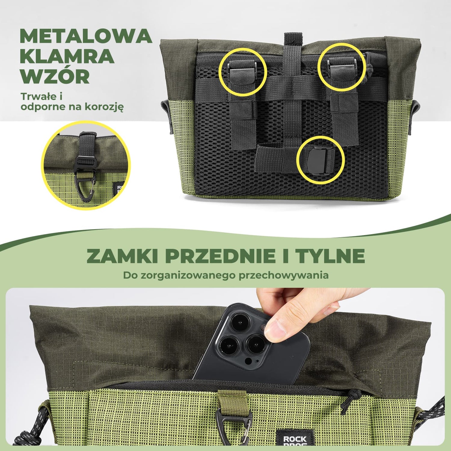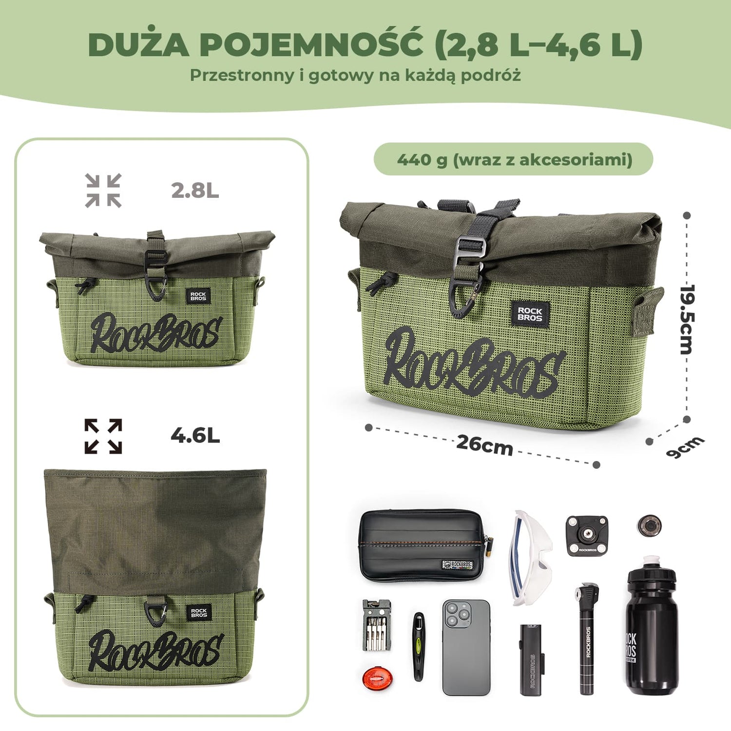 Regulowana pojemność pozwala wygodnie przechowywać najpotrzebniejsze akcesoria, takie jak telefon, portfel, klucze, narzędzia czy drobne zakupy, bez obciążania kierownicy.