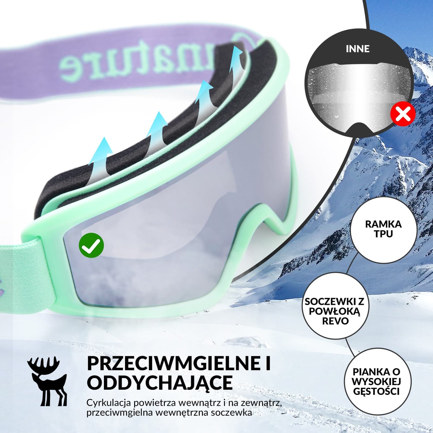 Zewnętrzna soczewka blokuje szkodliwe promienie UV i zapewnia ochronę UV400, a wewnętrzna powłoka przeciwmgielna skutecznie zapobiega parowaniu. Otwory wentylacyjne w górnej części ramki TPU wspierają cyrkulację powietrza i poprawiają komfort widzenia.