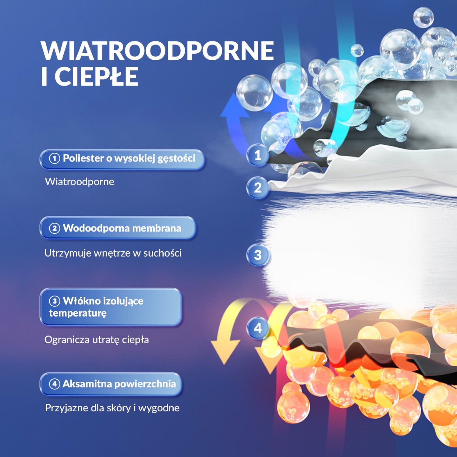 Wielowarstwowa konstrukcja skutecznie chroni przed zimnem: miękka podszewka z polaru jest przyjazna dla skóry, wypełnienie zatrzymuje ciepło, a membrana wodoodporna zapewnia suchość.