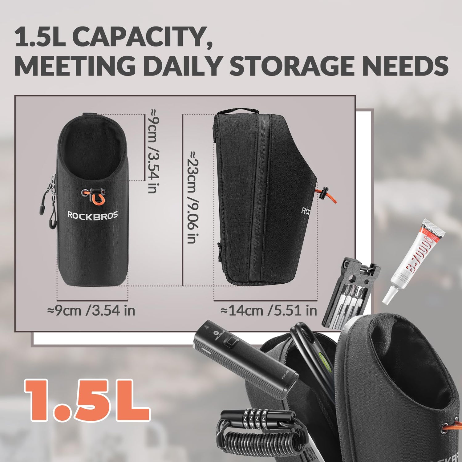 - 【POJEMNOŚĆ】Torba na kierownicę oferuje wystarczającą przestrzeń do przechowywania o pojemności 1,5 litra. Można w niej schować portfel, klucze, narzędzia itp. Można w niej umieścić telefon komórkowy o przekątnej do 6,7 cala. Nie trzeba się martwić, że zabraknie miejsca.