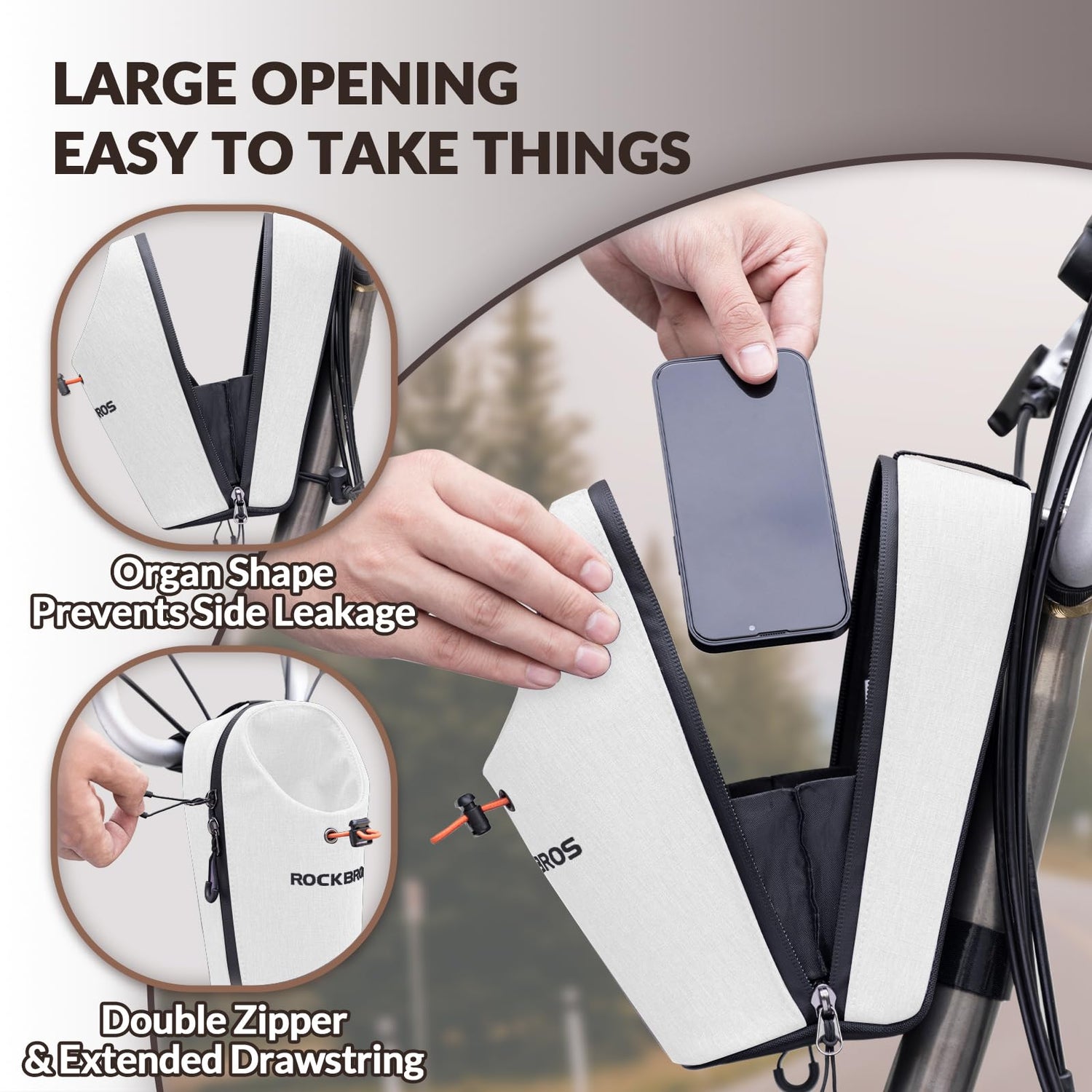 - 【PRAKTYCZNE】Uchwyt na bidon na kierownicy i jego konstrukcja ułatwiają wyjmowanie bidonu. Nie trzeba otwierać torby. Podwójny zamek błyskawiczny ułatwia otwieranie i zamykanie. Umożliwia to szerokie otwarcie przedniej torby bez jej rozdzielania. Elastyczny gumowy sznurek można ściągnąć, aby zapobiec przewróceniu się torby, gdy droga jest nierówna.