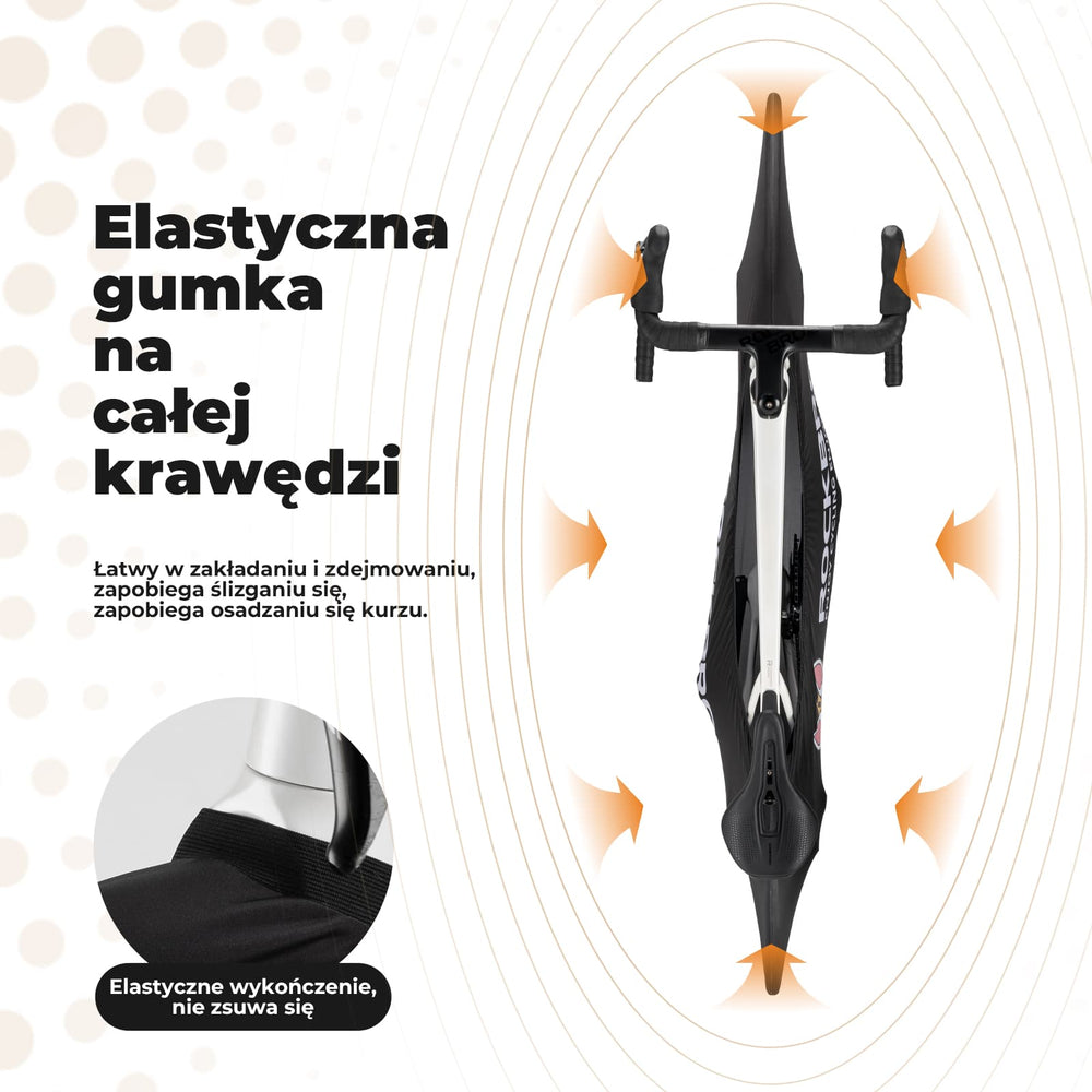 Elastyczna struktura umożliwia łatwe dopasowanie do rowerów o rozmiarze kół od 26 do 29 cali, w tym MTB, trekkingowych i szosowych. Pokrowiec dobrze przylega do ramy, nie przesuwając się podczas użytkowania.