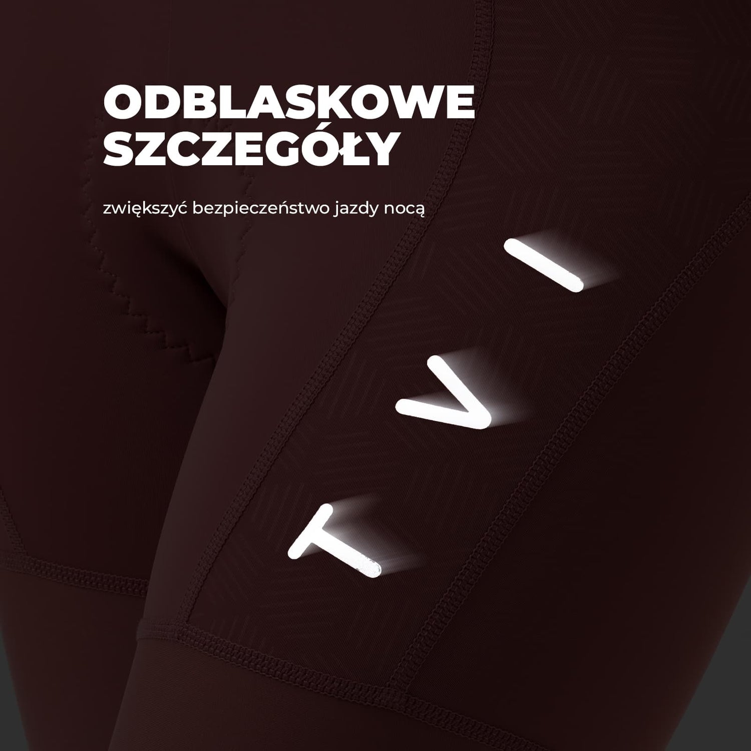 Bezpieczeństwo po zmroku – elementy odblaskowe Spodenki zostały wyposażone w wysokiej jasności detale odblaskowe, które znacząco zwiększają widoczność rowerzystki w warunkach słabego oświetlenia. To kluczowy element dbający o Twoje bezpieczeństwo podczas wieczornych treningów oraz przejazdów przez słabo oświetlone odcinki dróg.