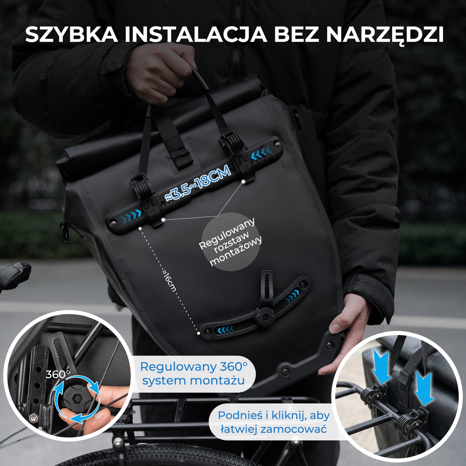 Stabilny i regulowany system mocowania Wytrzymałe klamry zapewniają pewne i stabilne osadzenie na bagażniku. Górne haki można przesuwać bocznie, aby dopasować je do różnych modeli rowerów, a dolny uchwyt montażowy obraca się o 360°, co eliminuje przesuwanie się sakwy podczas jazdy po nierównościach.