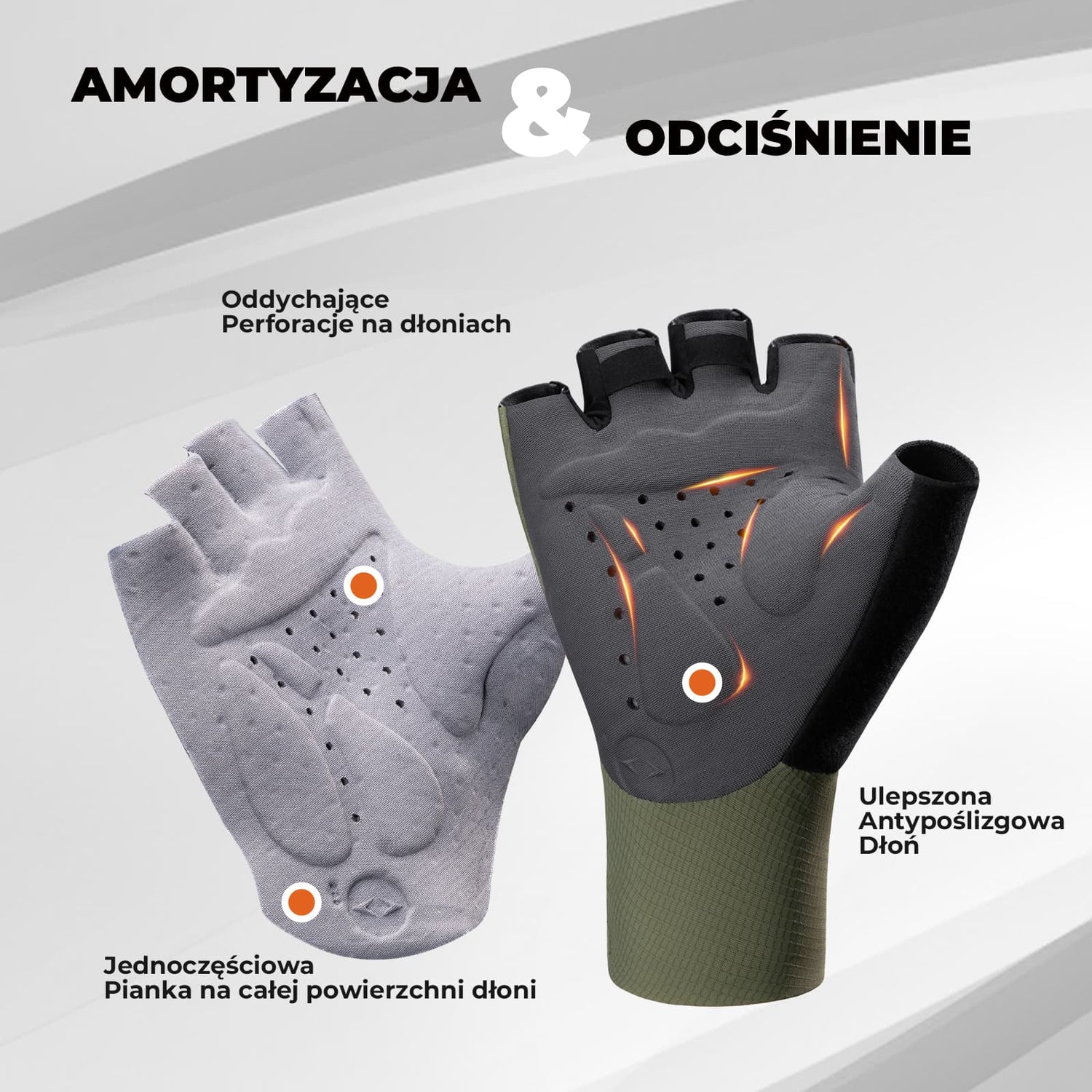 Zaawansowana amortyzacja – ochrona dłoni Wnętrze dłoni wyposażone jest w strategicznie rozmieszczone poduszki żelowe, które skutecznie absorbują wstrząsy i redukują ucisk na nerwy. Dzięki temu rękawiczki zapobiegają drętwieniu rąk i zwiększają komfort podczas długodystansowych tras szosowych i gravelowych.