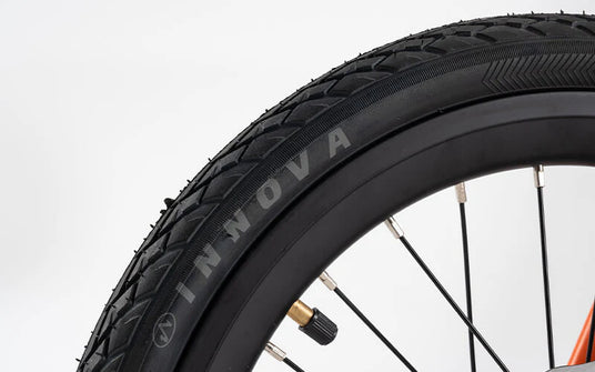 Opony 16×3/8 INNOVA z ochroną przed przebiciem i wzmocnionymi bokami odporne są na szkło i żwir. Profilowane, o niskim oporze toczenia zapewniają płynną jazdę po asfalcie, krawężnikach i niewielkich nierównościach.