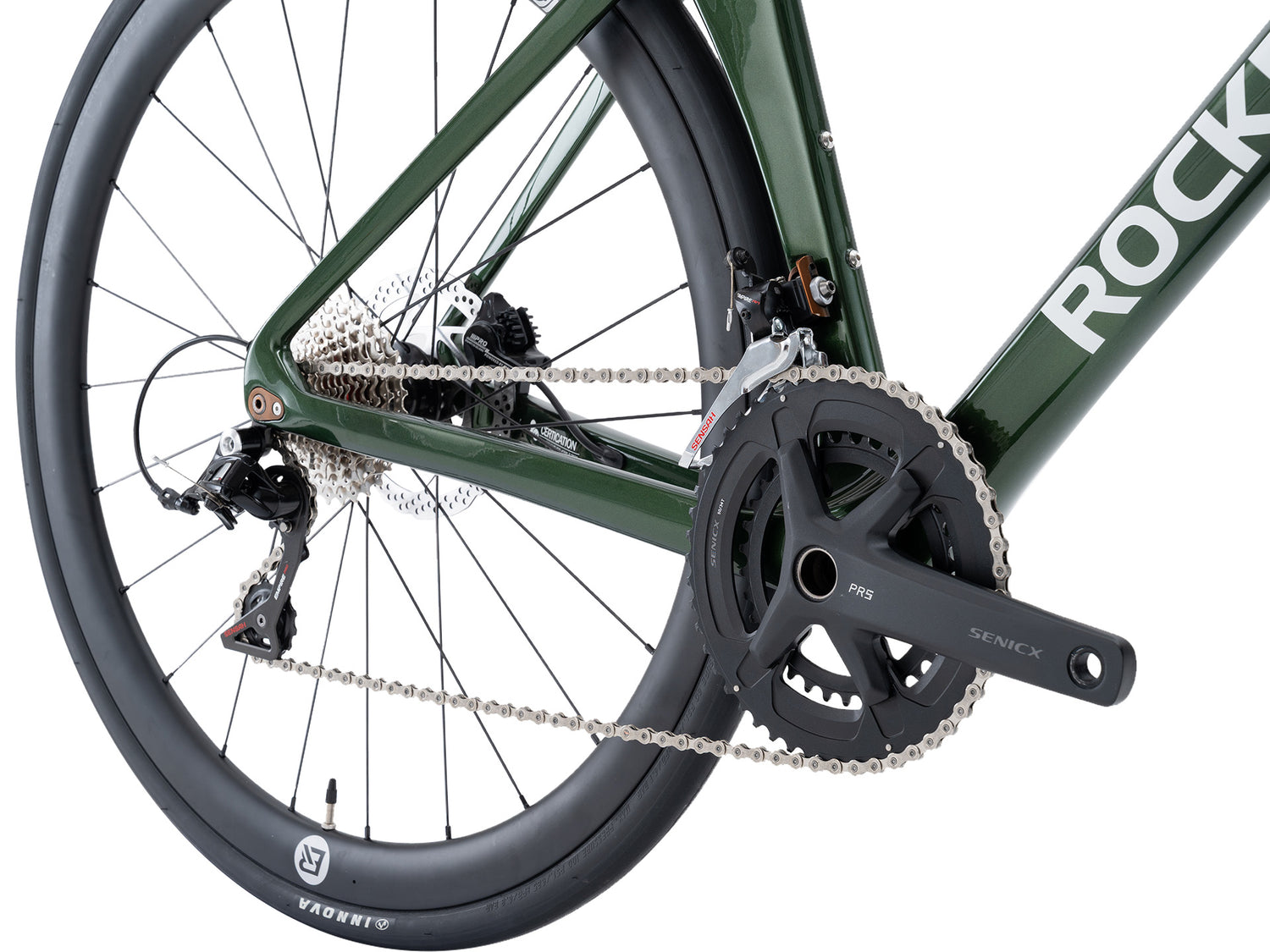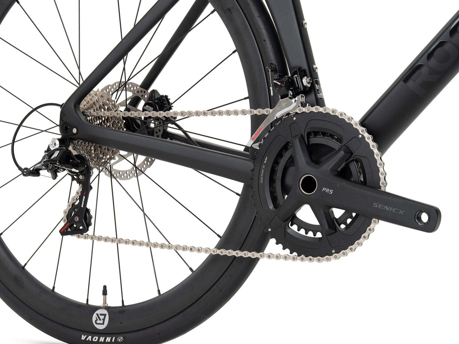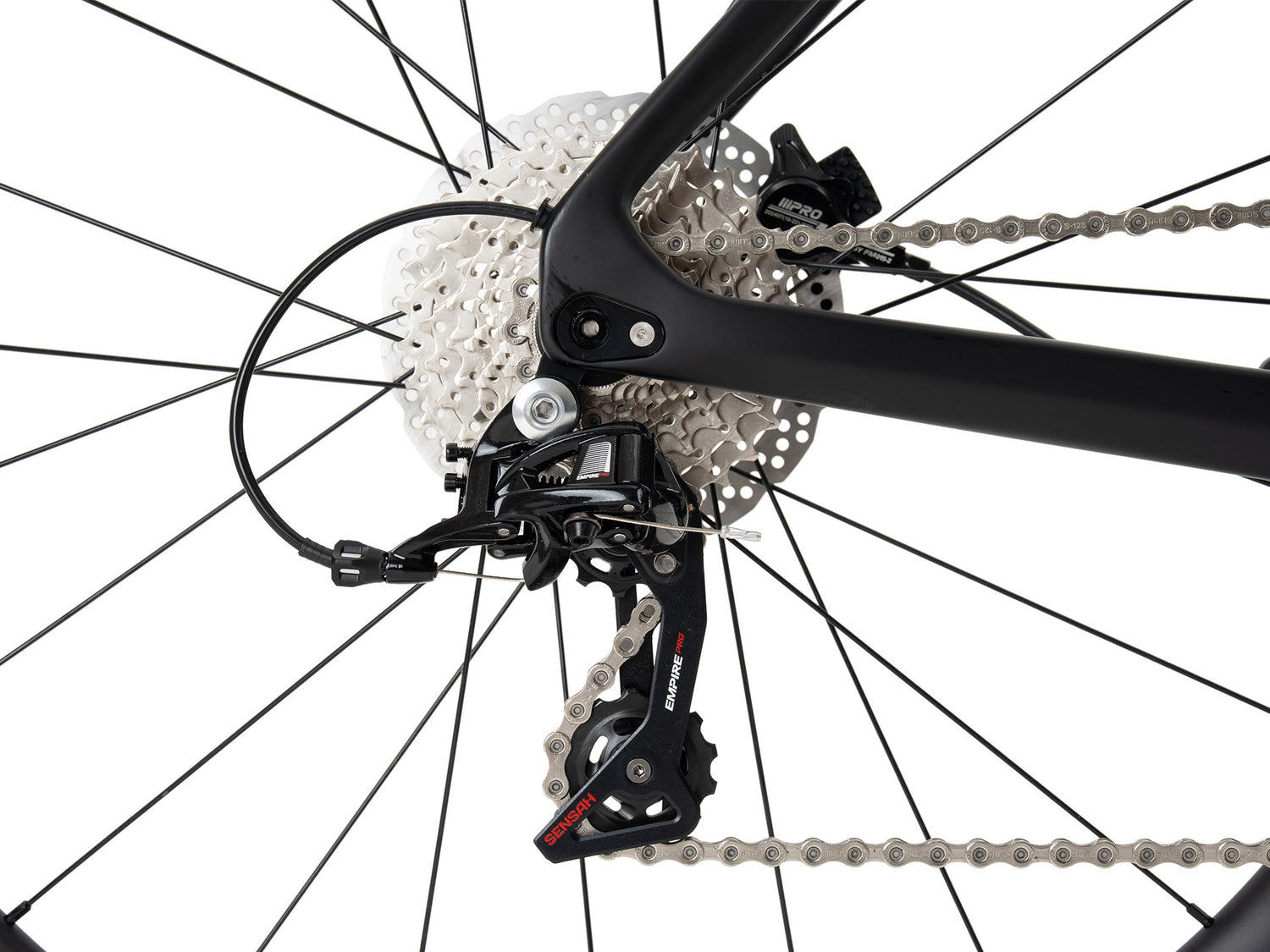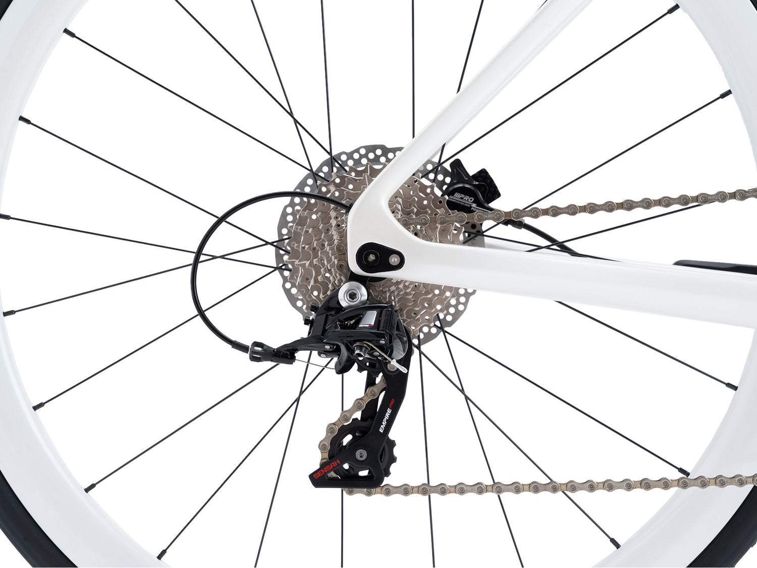 Hydrauliczne hamulce tarczowe SENSAH EMPIRE PRO z okładzinami chłodzącymi zapewniają stałą siłę hamowania — nawet podczas długich zjazdów. Karbonowe koła o wysokości stożka 40 mm łączą lekkość z korzyściami aerodynamicznymi, co umożliwia efektywne podjazdy i szybkie sprinty na płaskich odcinkach.