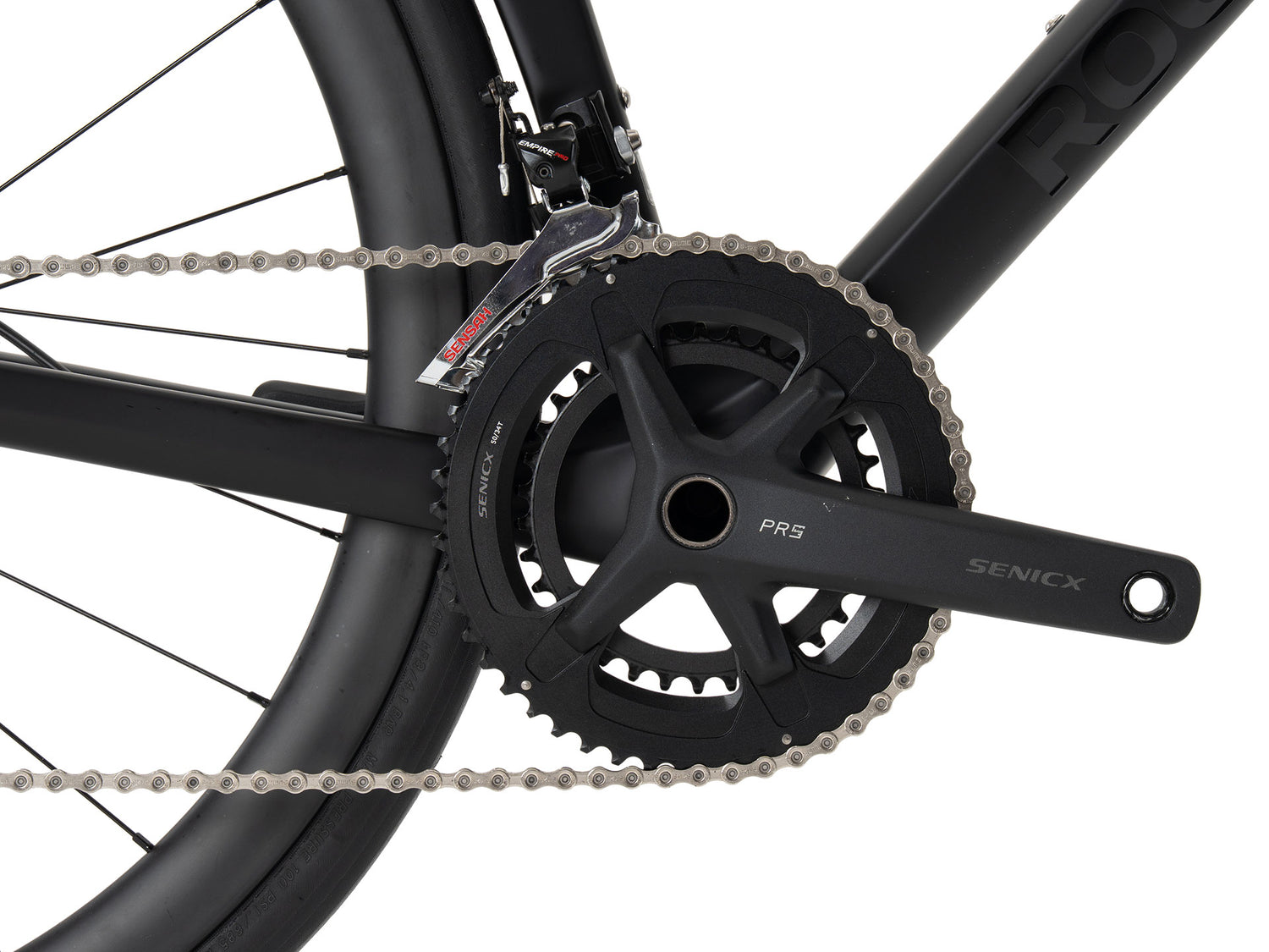 Precyzyjny, 24-biegowy napęd 2x12 z karbonowymi klamkomanetkami SENSAH EMPIRE PRO gwarantuje niezawodne, płynne zmiany biegów, niską wagę i ergonomiczną, komfortową obsługę.