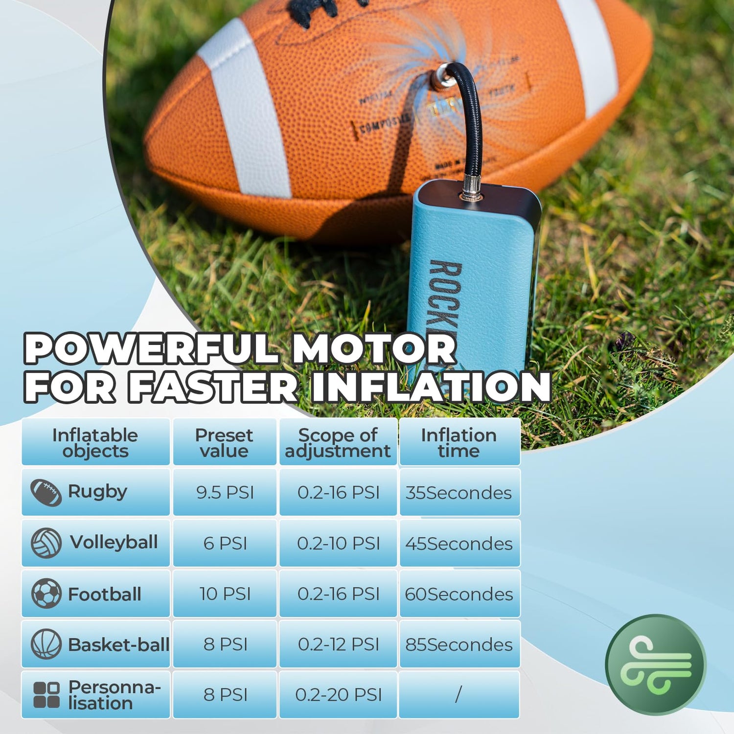 ROCKBEOS Elektryczna Pompka do Piłek z 4 Zapasowymi Igłami Akumulatorowa Pompka Powietrza 20PSI 1400mAh Przenośna Mini Pompka do Siatkówki, Koszykówki, Piłki Nożnej i Pływania