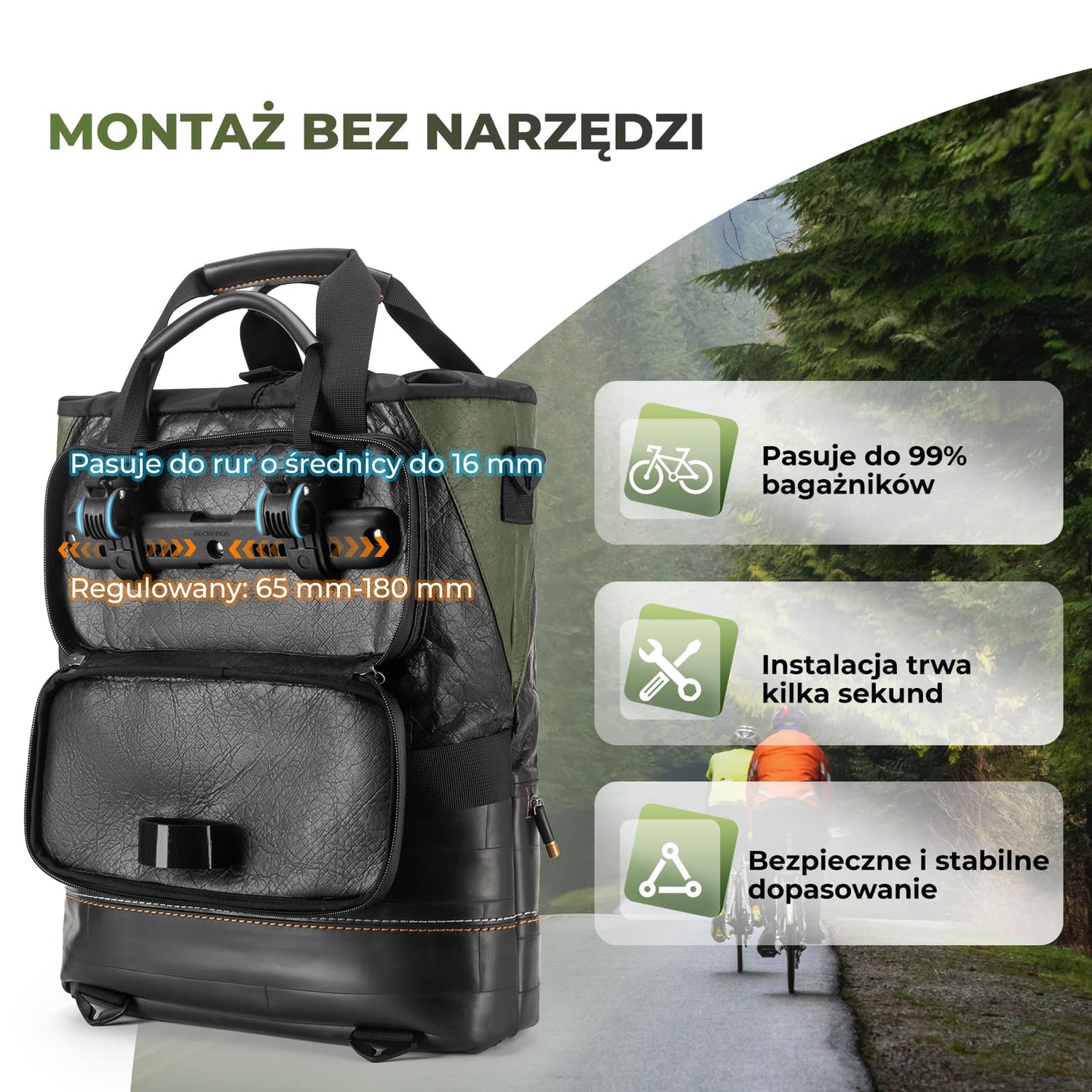 Torba została wyposażona w mocowania dostosowane do większości standardowych bagażników rowerowych. Ułatwia szybki montaż i demontaż, co sprawia, że jest praktyczna i wygodna w użyciu.