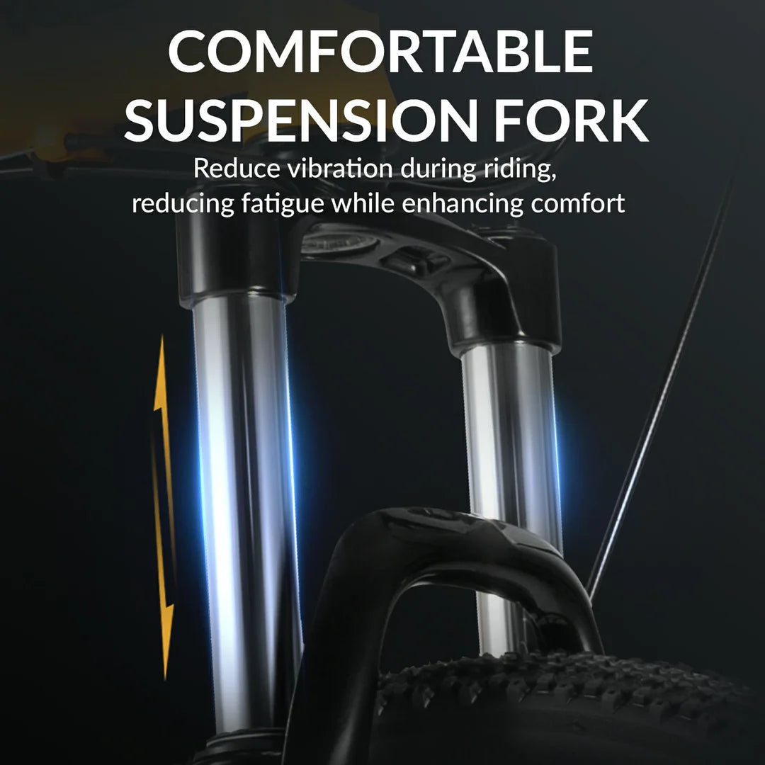 Wytrzymały aluminiowy widelec amortyzowany skutecznie pochłania nierówności nawierzchni i uszkodzenia dróg, zapewnia płynne pedałowanie oraz zmniejsza zmęczenie podczas długich tras — dla wyraźnie większego komfortu jazdy.