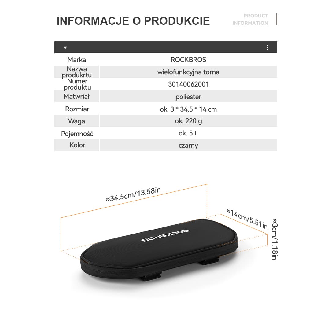 Torba ROCKBROS o pojemności 5L zapewnia wystarczająco dużo miejsca na wszystkie niezbędne akcesoria: narzędzia, pompki, dętkę, ubrania przeciwdeszczowe czy prowiant. Doskonała na długie przejażdżki i wyprawy rowerowe, łącząc praktyczność z kompaktowym wyglądem.