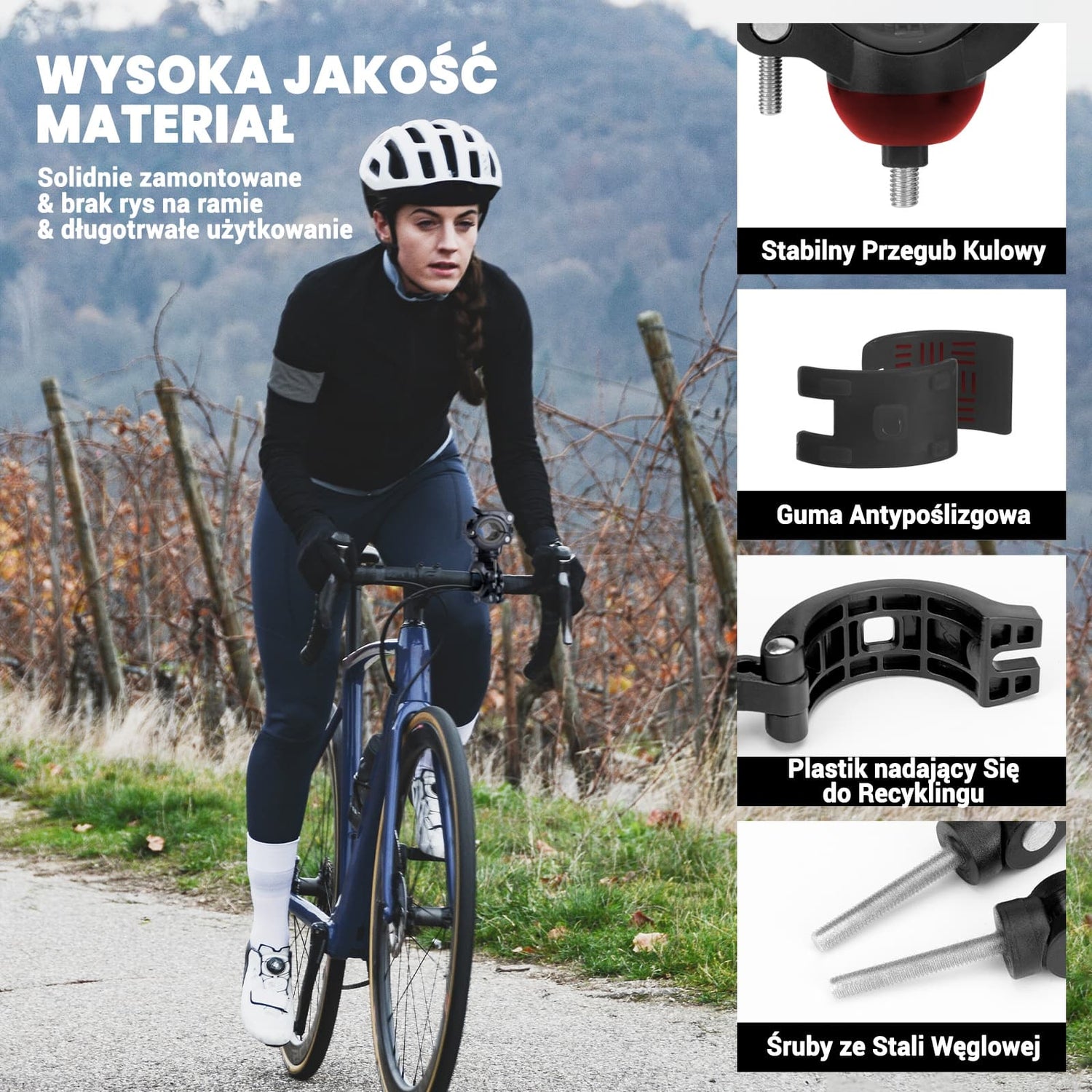 Wykonany z wytrzymałych materiałów, uchwyt jest stabilny i odporny na wstrząsy, co zapobiega przypadkowemu odpadaniu lampki podczas jazdy po nierównym terenie.