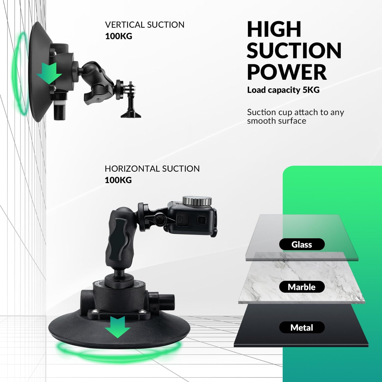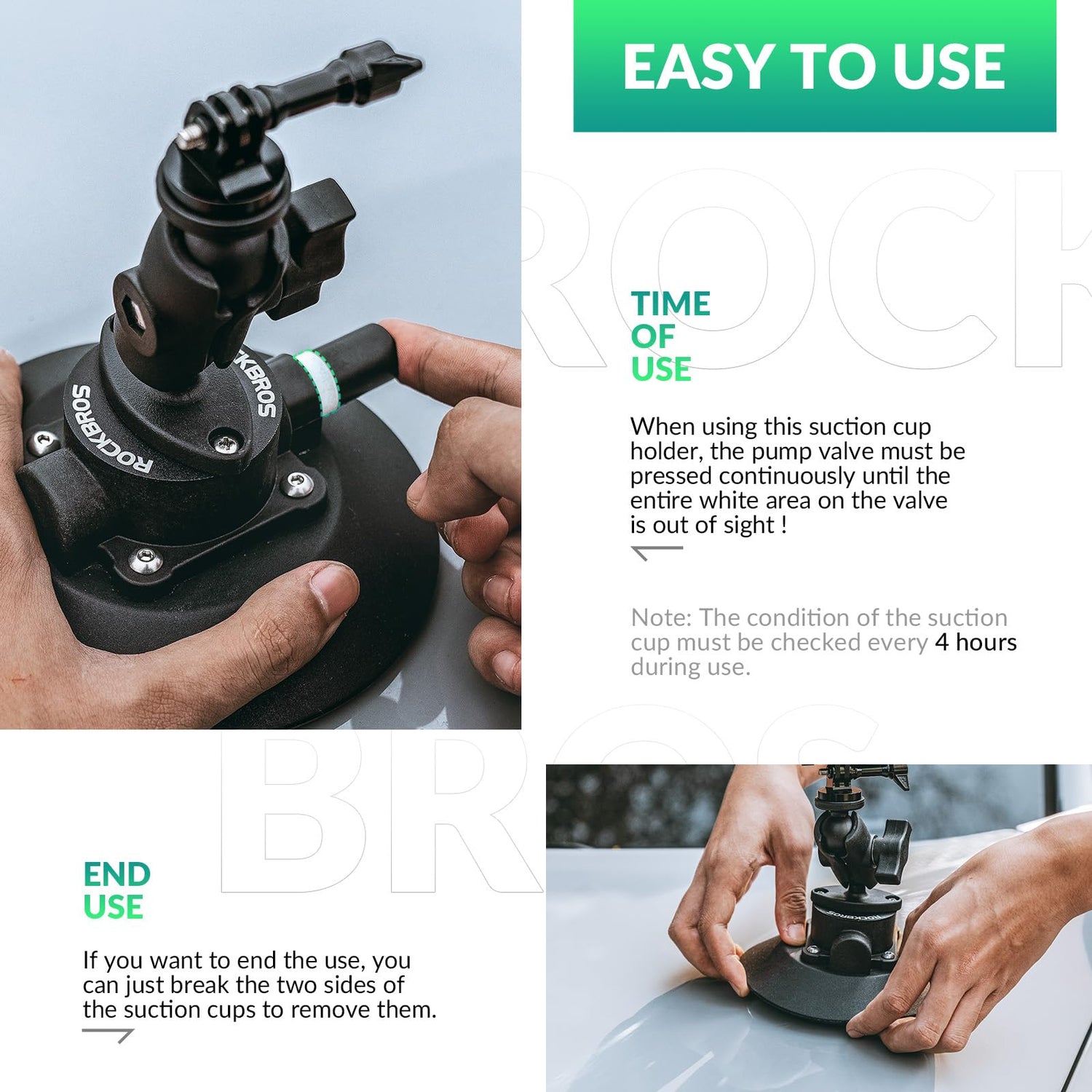 - 【SUPER UDŹWIG】 ROCKBROS uchwyt przyssawkowy do kamery jest wykonany z wytrzymałego nylonu i wysokiej jakości gumy. Jest wyposażony w pompkę powietrza klasy przemysłowej i 15-centymetrową przyssawkę próżniową o większej sile ssania, udźwigu do 5 kg i pionowej sile ssania do 100 kg. Jest kompatybilna z różnymi kamerami sportowymi, takimi jak GoPro Hero 10, 9, 8 MAX, 7, 6, 5 Session, DJI Osmo Action i Sony itp.